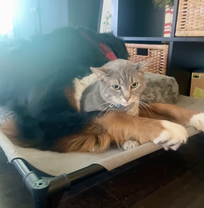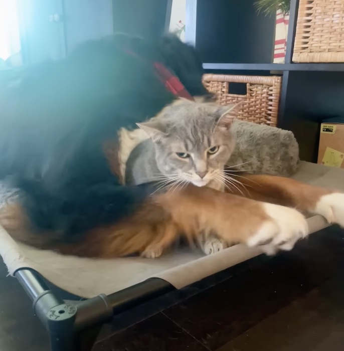 This is a very unusual relationship for dogs and cats. They usually don’t get along. It’s not that they’re enemies but they have different body languages.