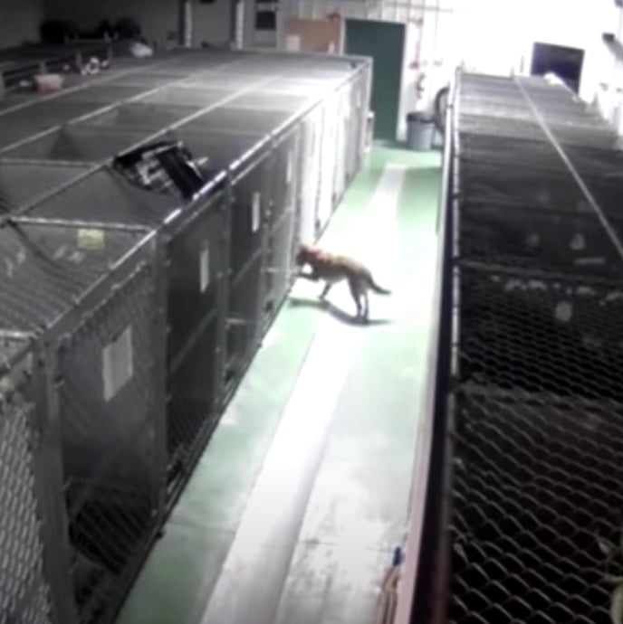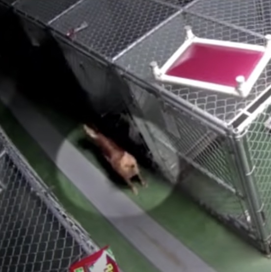 Maggie was able to sneak out of her kennel after pushing her water bowl aside and squeezing through the opening.