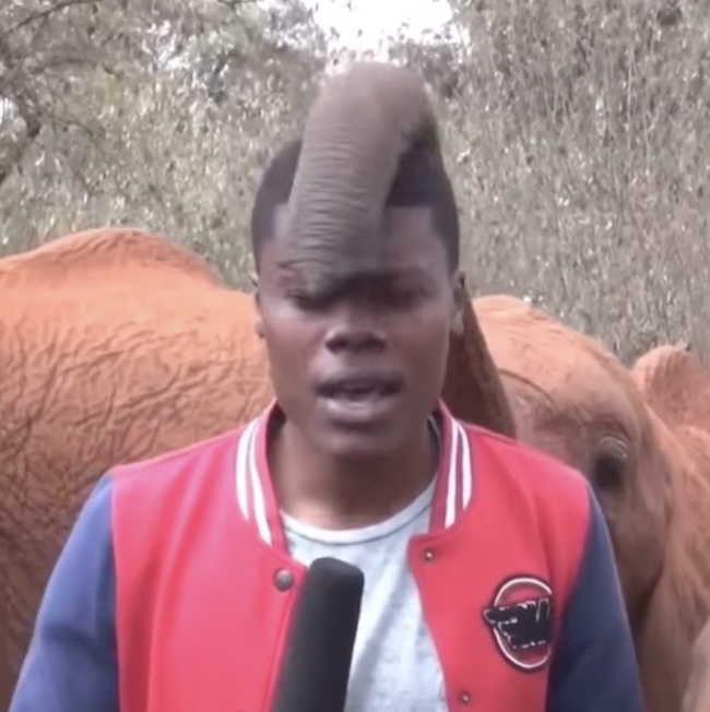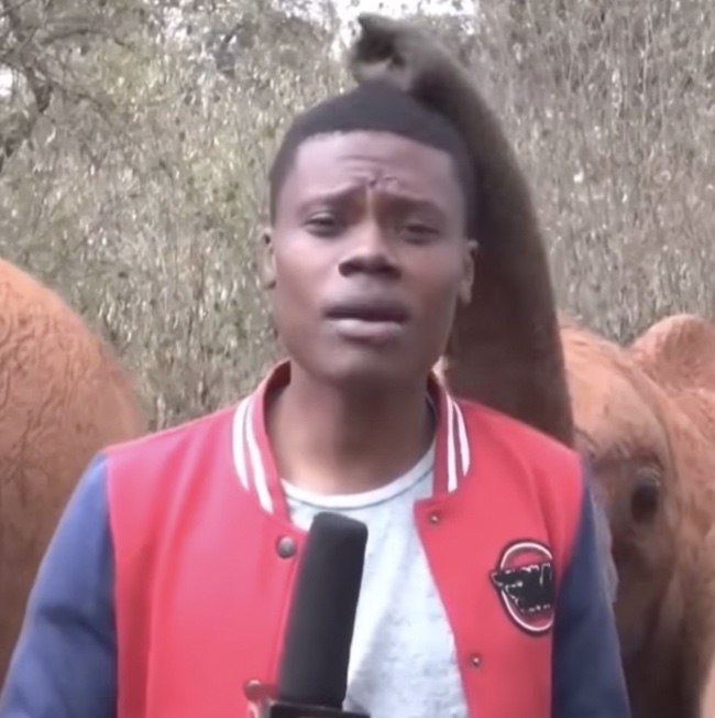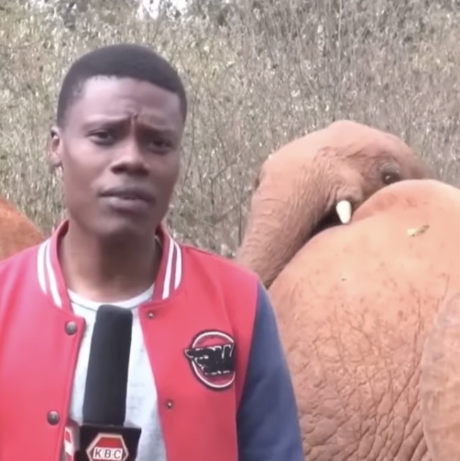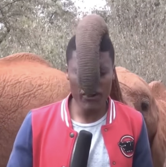 He taps Kaunda on his ears with his trunk. Meanwhile, Kaunda is keeping his cool. He keeps a straight face and went on with his news report.