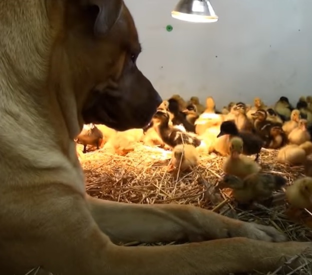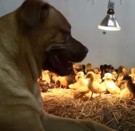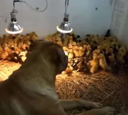 The ducklings just walk on their feet, legs, and all over as Dug gently sits and watches them have fun.