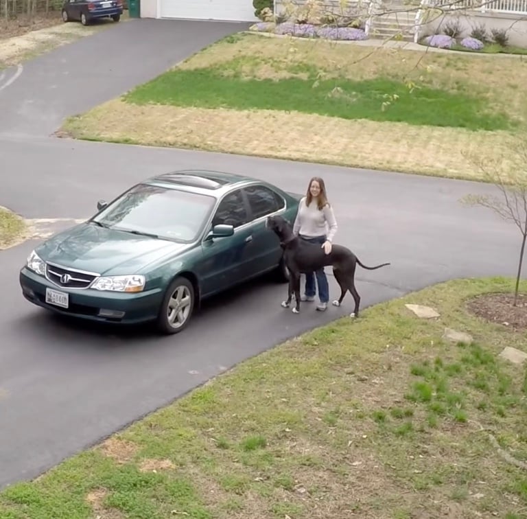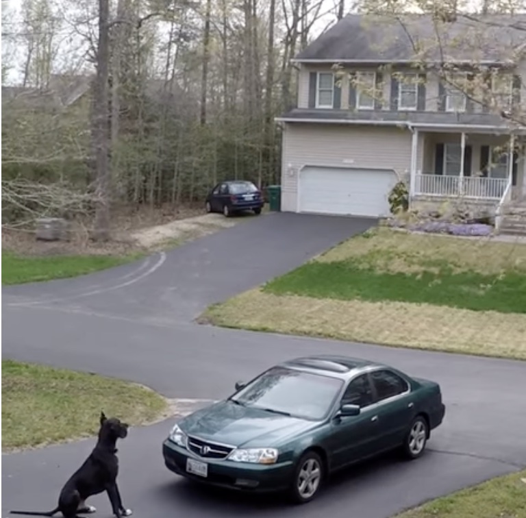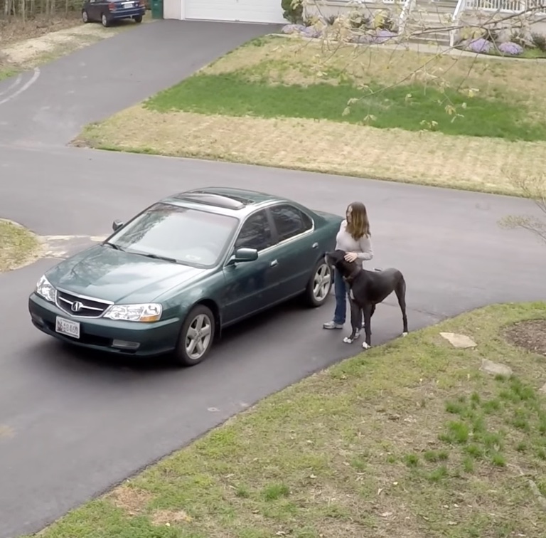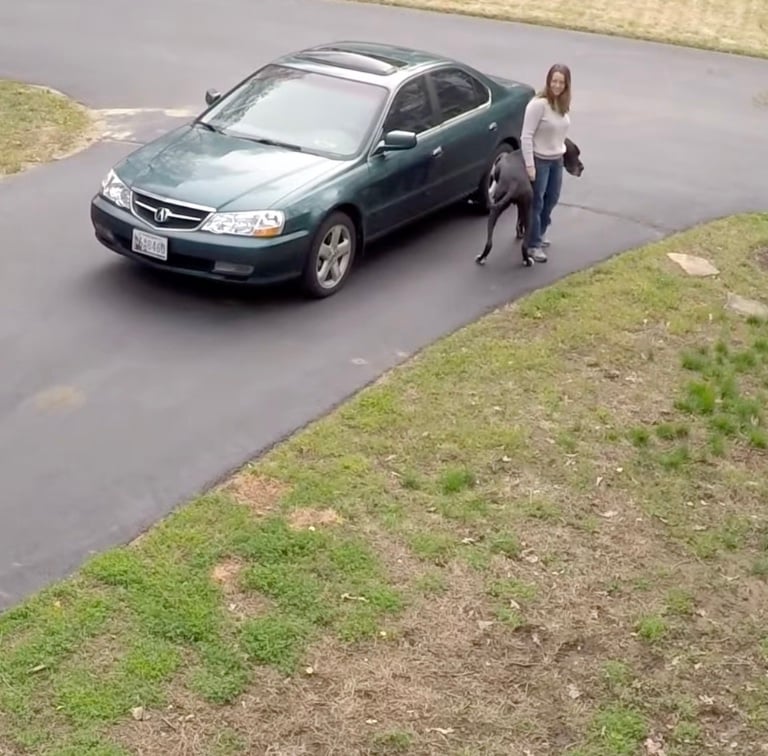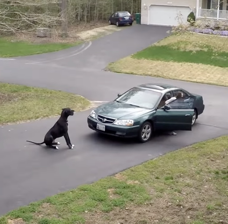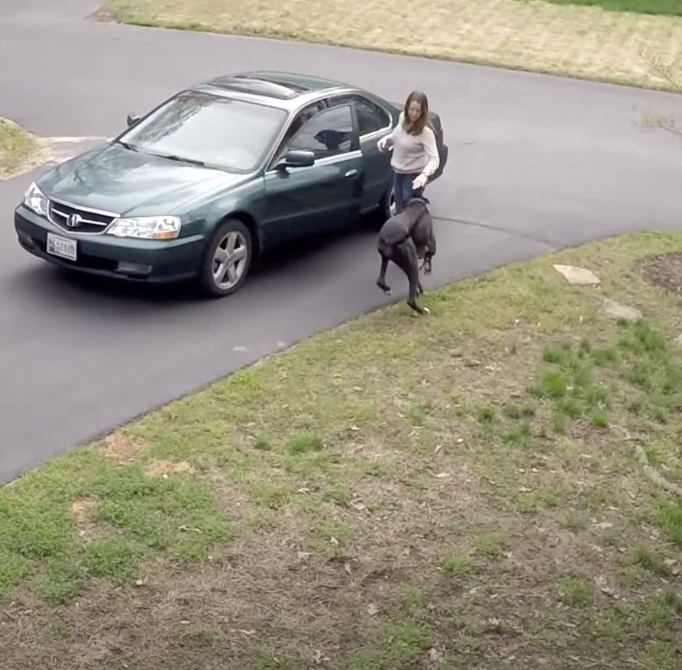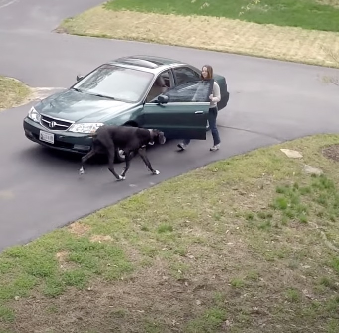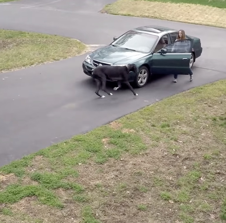 Her rescued Great Dane gets so excited to see her that he doesn’t even let her get fully into the driveway.