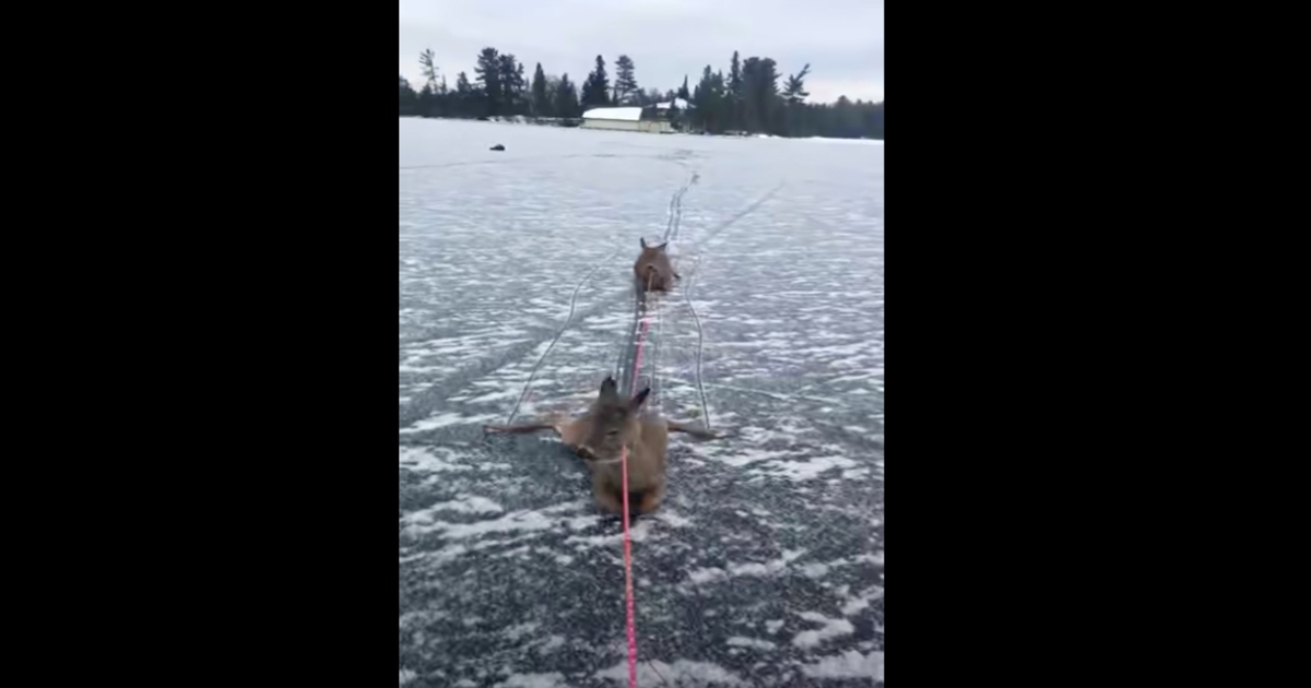 Ryan was gliding across the lake when he saw a group of three whitetail deers splayed on the ice and unable to move.