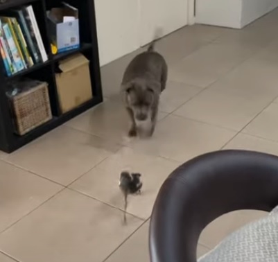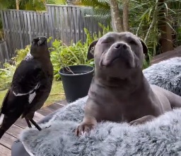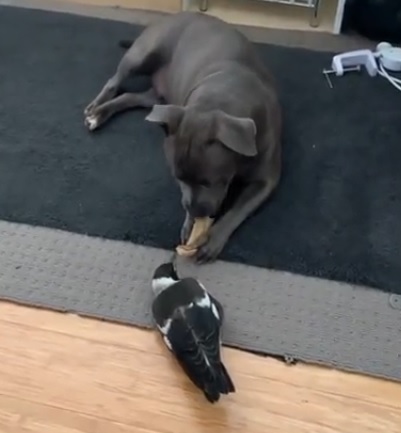 It’s obvious that the much smaller magpie is not scared of her pooch friend one bit.