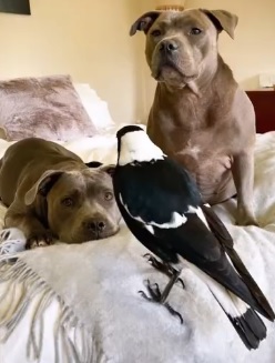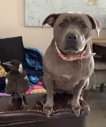 Peggy is a Staffordshire bull terrier, who made a new bestie with this magpie bird named Molly