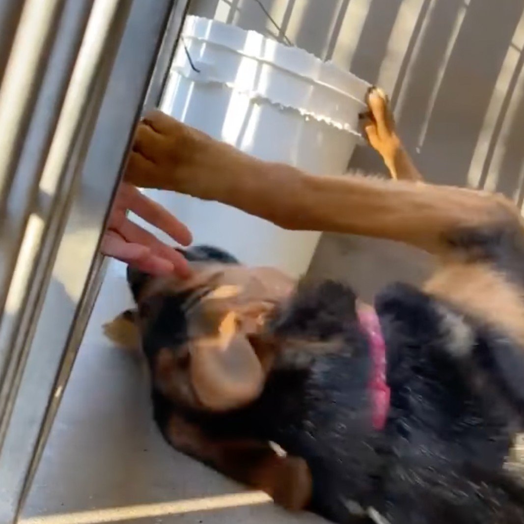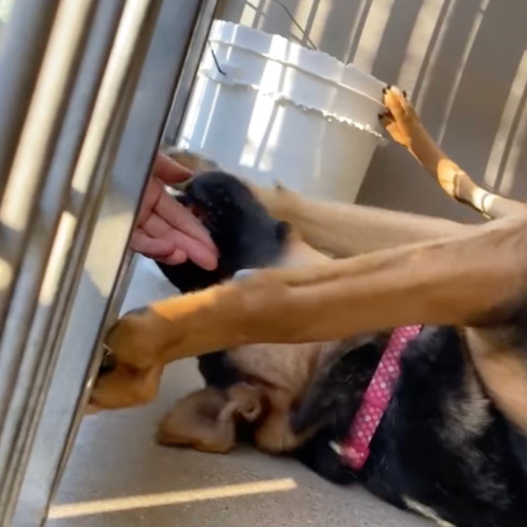 When the person puts their hands inside her crate to pet her, Maxine wriggles around, trying to lick the hands of her visitor or put her head under the hand for some pets.